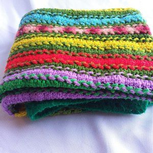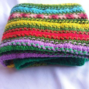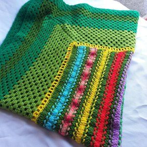 TITLE: Vintage Crochet Baby Hand Made Quilt Granny Square Knit Yarn Throw Green Orange yellow Pink