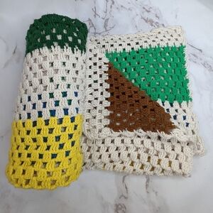 Vintage Crochet Blanket Throw Afghan Retro Brown Yellow Cream Blue Boho Stripe