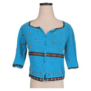 Vintage Crochet Cardigan Sweater Y2K 90s Floral Beaded Boho Hippie Blue M