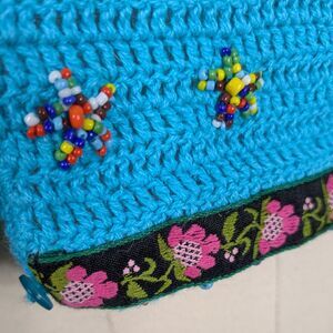 Vintage Y2K crochet cardigan sweater with floral trim and beading from My, size medium. Blue open knit with 2/4 sleeves, floral trim in black, multicolor beadwork. Ideal for hippie, 90s, boho, bohemian, eclectic, cottage, feminine, and festival vibes. Perfect for layering, spring, summer, work/office, beach, cruise vacation, and festival.