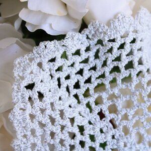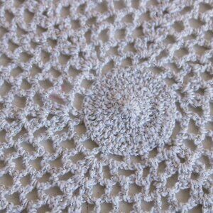 Lovely vintage crocheted doily in white ( or perhaps a very pale gray) with silver threads shot through. Very lacey and delicate. I believe this is circa 1960s or so.