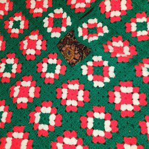 Charming handmade holiday crochet tree skirt in classic red, white & green granny square design. Measures approx 35” x 34” (not counting tassels). Festive pointed edging with alternating tassels.