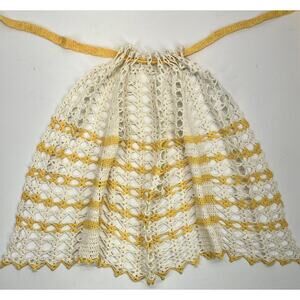 Vintage Crochet Half Apron Yellow Ivory Chevron Stripe Tie Back Halter Top. Handmade knit crochet apron. Can be worn as skirt layer, or slightly modified to be a halter top. Top portion of apron measures 16” across (not including crochet ribbon tie. Bottom measures 27” across. 15” tall. One spot on ribbon as shown in last picture.