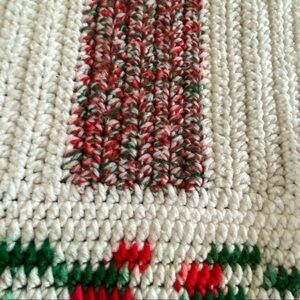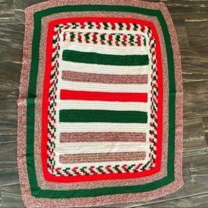 This is a gorgeous handmade Christmas throw with red, green and white stripes. Some sparkly yarn.