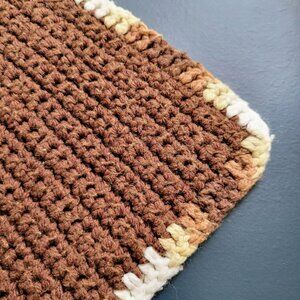 This vintage crochet afghan showcases a beautiful design of pink, cream, and rich brown stripes. Its handmade charm and intricate pattern add timeless warmth to any room. Ideal for layering on a couch or bed for an inviting, classic touch.