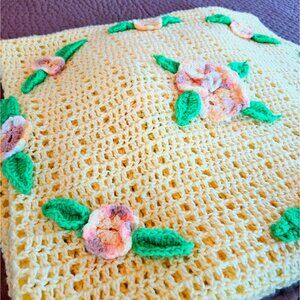 Vintage Crochet Yellow Floral Blanket Topper 70 x 80 Handmade Afghan & Flowers