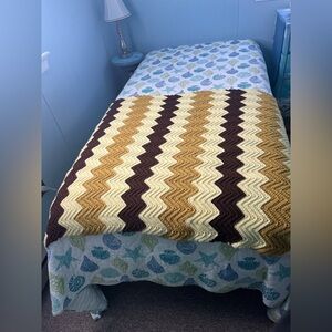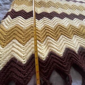 This vintage handmade crochet afghan throw blanket is a great addition to any room. With a zig zag chevron pattern in off white, tan and browns this bed throw is perfect for teens, adults, and kids alike.