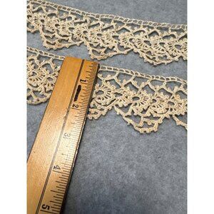 This exquisite vintage lace trim showcases the refined handwork of a bygone era. The delicate cotton thread forms an intricate scalloped pattern with open lattice work and fan motifs. The natural ecru color has aged gracefully, lending an authentic antique patina to this decorative trim.