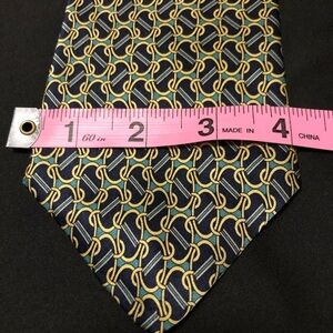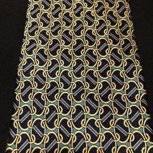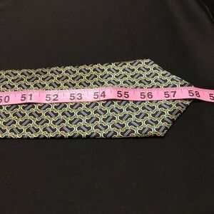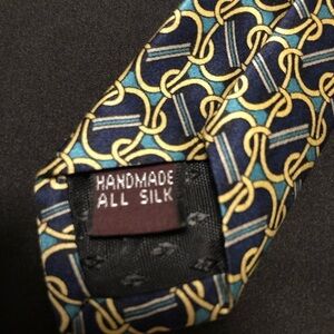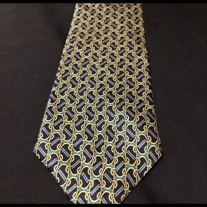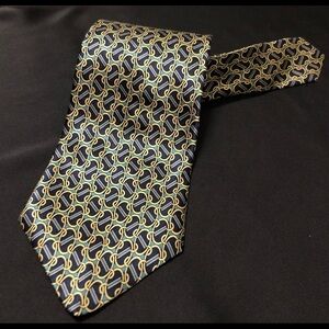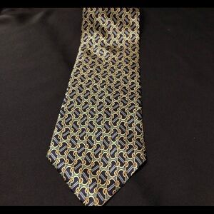 Fabulous Vintage Cromley & Finch of London Handmade 100% Silk Tie. Abstract Link Design featuring Gold, Black, Green and Blue. This tie measures 4”x 58”. No rips, holes, smells or stains. In amazing and clean condition. Smoke and Pet Free home.