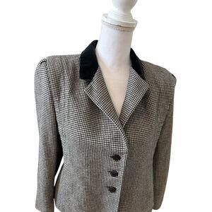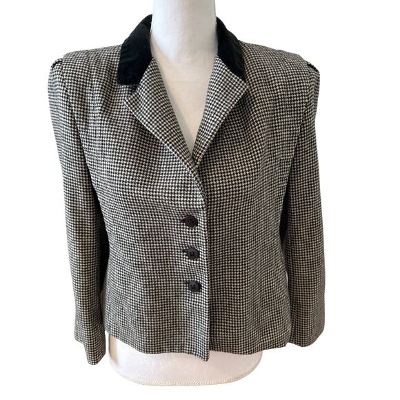 Vintage Cropped Boxy Houndstooth Knife Pleat Puffy Blazer Velvet Trim, size 10P. Good Preowned Condition, Wool, Knife Pleat at shoulder, notched collar, fully lined, pockets and button closure. Great cropped style to pair with your wide leg denim this fall!