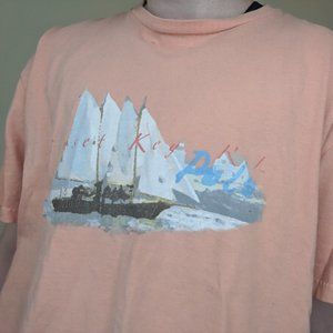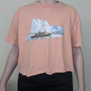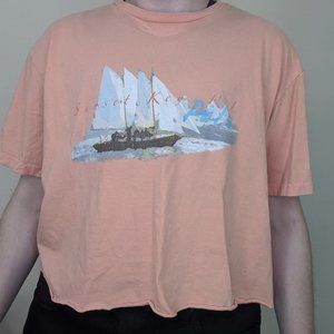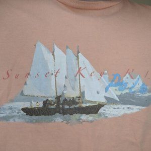 Cute vintage peach colored short sleeve Polo Ralph Lauren tee shirt. Hand cropped with a raw hem. Has an image of a sailing boat that reads Sunset Key Polo. Good condition. Tagged a men's medium.