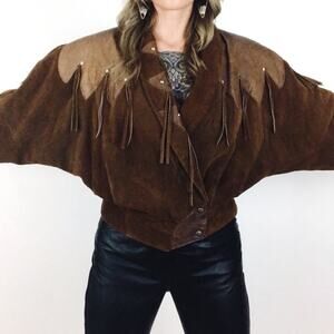 Vintage western jacket in brown suede leather with fringe. Features ostrich leather detail at yoke and shoulders, stud and fringe embellishments, and rolled lapel collar. Dolman sleeves, pockets at sides. Cocoon silhouette, wrap waist with snap closure.
