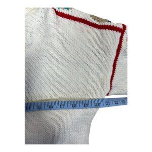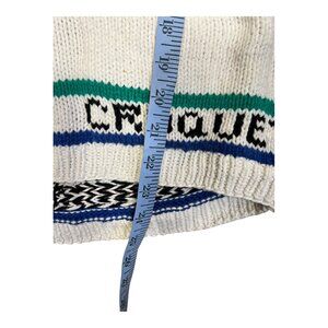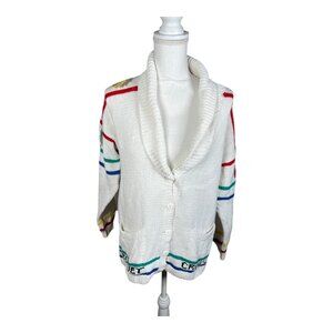 How adorable! This knitted cardigan features croquet players and equipment--mostly on the back and sleeves. One spot on the back, see the third photo. No other flaws other than normal wear.