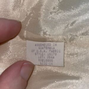 Cross Country fashions brand. This is Vintage. Made in the USA but assembled or sewn in Guatemala. Single button white wool blazer. Possible to reuse in crafts to make mittens or repair. It’s difficult to find vintage clothes perfect and this is no exception. Women size 14.