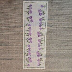 Vintage Handmade Cross Stitch Crocus Embroidered Table Runner White Purple Table Cloth.