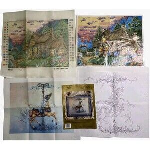 * Used preowned condition. This listing is for patterns only. No floss. Something Special counted cross stitch includes the Aida cloth and easy to follow instructions. Janlynn English cottage includes the canvas and the paper picture. The Janlynn has been started already as seen on the photos.