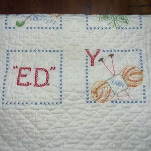 Charming vintage baby quilt featuring cross-stitched alphabet blocks from A to Z, each square illustrated with colorful characters, animals, and objects. Dated “8-31-70” and personalized with the initials “ED,” this handmade piece is a beautiful example of heirloom needlework.