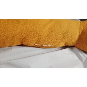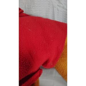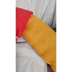Please see pictures, and use your judgement, He has no tips or tears, he is used and vintage, he does have a few stains or discoloration on his side of his shirt and a tiny burn on his shirt area.