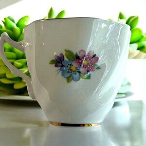 FEATURES: Crown backstamp: “Bone China Made in England” / mid-century / Multicolor floral design / Gold trim on cup rim and saucer edge