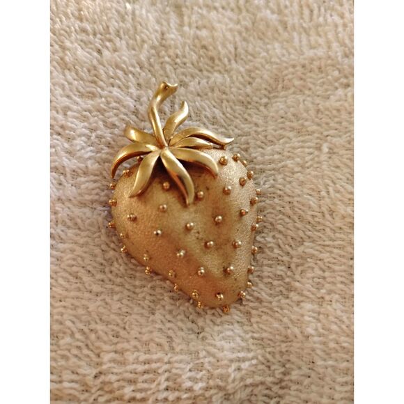 Vintage Crown TRIFARI Signed Gold Tone Strawberry Brooch Pin Figural Fruit