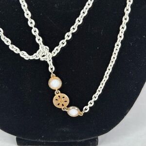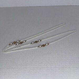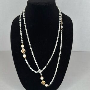 This exquisite necklace showcases a delicate silver chain adorned with gold-toned beads and pearl-like accents, creating a sophisticated mixed-metal look. Its long design allows it to drape elegantly, making it a versatile accessory for any occasion.