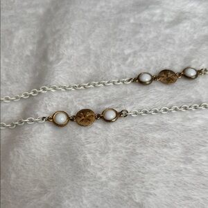 I'm unable to find the brand marking but it is assumed to be this brand based on Google research. The necklace is approximately 27 inches folded. This was purchased from an estate sale. The colors are white and gold. This necklace has some weight to it.