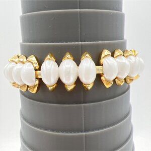 Vintage Crown Trifari Bracelet Gold Tone Faux Pearl Accents Foldover Clasp READ