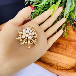 Vintage Crown Trifari Brooch Gold T Faux Pearls Rhinestones Flower Floral 4445