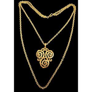 Vintage signed Crown Trifari brushed gold-tone double-strand necklace with large scroll-work pendant. Longest chain is 48". Pendant is 2 1/2" x 2". In good vintage condition. Circa 1960's.
