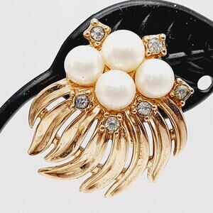 Add timeless elegance to your collection with these vintage Crown Trifari clip-on earrings from the mid-20th century. These stunning earrings feature creamy faux pearls at the center, surrounded by sparkling rhinestones and set in rich gold-tone metal with a bold, sculptural design. Perfect for weddings, cocktail parties, or everyday vintage-inspired style.