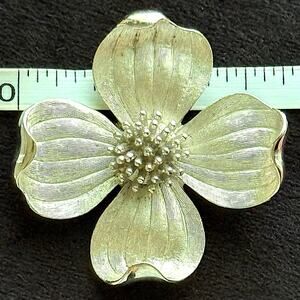 The Vintage Crown Trifari Signed Set features a beautiful dogwood blossom design in a silver tone, perfect for both men and women. This set includes a brooch, and earrings, all made from high-quality silver metal. The Trifari brand ensures a timeless and elegant look, making this collection a valuable addition to any vintage jewelry assortment. Ideal for those who appreciate classic fashion and unique accessories.