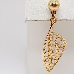A classic pair of vintage Crown Trifari earrings with a delicate openwork filigree design. Crafted in gold-tone metal, the earrings feature lightweight dangle drops with elegant swirls, perfect for both everyday wear and special occasions.