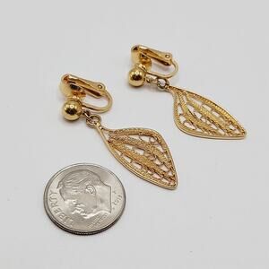 Vintage Crown Trifari Gold Tone Filigree Clip Earrings Dangle Drop Signed