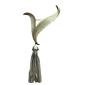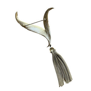 The Vintage Crown Trifari Golden Tassel Brooch is a stunning piece of mid-century statement jewelry that exudes retro elegance. This abstract-shaped brooch features a luxurious yellow gold plated metal construction, with a tassel accent adding a unique touch to its design. Signed by Trifari, this vintage piece is perfect for special occasions like Mother's Day, Christmas, anniversaries, and birthdays. Made in the United States, this original brooch embodies the fashion trends of the mid-20th century and is a must-have for women looking to add a touch of vintage glamour to their ensemble. In good vintage condition - a show stopper!