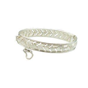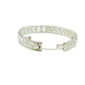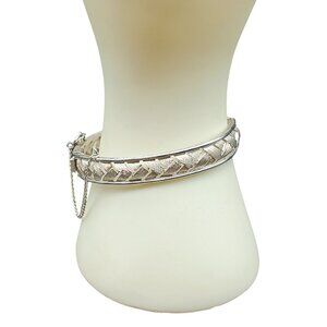 This exquisite vintage sterling silver bangle exudes timeless elegance with its intricate lattice design. The hinged closure offers ease of wear, while the safety chain ensures it stays securely on your wrist. Perfect for collectors and those who appreciate fine craftsmanship, this piece adds a touch of sophistication to any outfit.