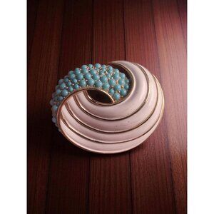 This elegant vintage Crown Trifari brooch features a sculptural swirl design with glossy white enamel and vibrant faux turquoise cabochons set in gold-tone metal. A classic mid-century design that adds a pop of color and timeless sophistication to any collection.