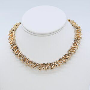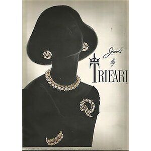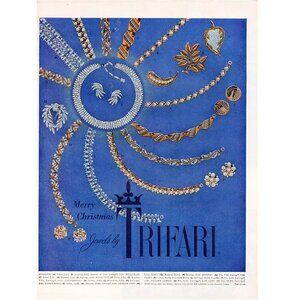 This is a vintage 1956 Trifari Stonybrook line necklace, a graceful mid-century design that combines elegance with classic wearability. The necklace features gold-tone curved ribbon-like links, each set with a luminous simulated pearl and accented by sparkling rhinestones. It is signed Trifari © on the clasp. The Stonybrook design was highlighted in Trifari’s 1956 advertising campaigns, including the Trifari Merry Christmas ad and an ad solely for the Stonybrook line, making it a highly collectible piece. A beautiful example of Trifari’s craftsmanship, this necklace is ideal for collectors or anyone seeking a touch of vintage sophistication.