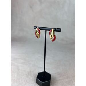 Vintage Crown Trifari Stud 1” Pierced Drop Earrings Gold Tone Red Enamel Vintage