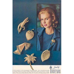 This is a vintage 1962 Trifari wheat brooch, beautifully crafted in textured and polished golden Trifanium. The elegant stalk and flowing leaves capture the naturalistic style Trifari was celebrated for in the early 1960s. This brooch is both a book piece (featured in Julia C. Carroll’s Collecting Costume Jewelry 202, p. 229) and an advertised design, shown in a 1962 “Jewels by Trifari” magazine ad alongside other nature-inspired motifs such as the acorn, palm tree, and shell. A collectible mid-century Trifari brooch, ideal for adding to your vintage jewelry collection or for gifting to a Trifari enthusiast.