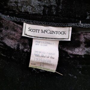 A Scott McClintock black crushed velvet skirt, in size 14. Vintage, from the 1980s! Back kick pleat for ease of movement, hidden back zipper closure. Fully lined, made in USA. 29 inch waist, 27 inch length.