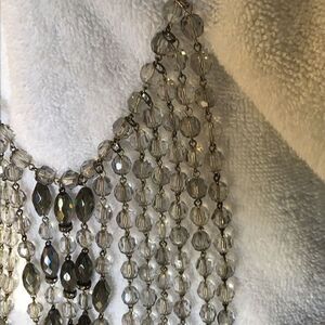 Unique crystal bib style necklace, 16' to 19" adjustable length. The drop chains measure from 6-3/4" to 9" in length. Total of 17 drop chains to comprise the bib. The neck chain and drop chains are built from round pale gray crystals individually suspended on silver tone chain (not crammed onto a bead wire). The spacing enhances the sparkle of each crystal. The side drop chains each end in a marquise shaped dark gray aura borealis bead. Working toward the center, there are increased dark gray marquise shaped beads. The 3 center chains also include rhinestone rondelle beads. This is definitely a statement necklace.......sure to spark conversation and garner attention! Beautiful condition.