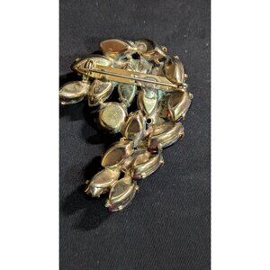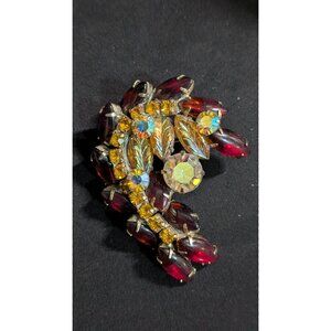 Vintage Crystal Brooch W/ Red & Yellow Rhinestones Leaf Design Retro Jewelry