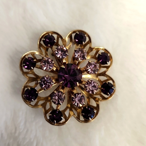 Vintage Crystal Brooch with Purple & Clear Stones Goldtone