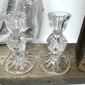 Vintage Crystal Candle Holders Set Of 2 Etched Floral Design Clear Glass Elegant