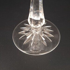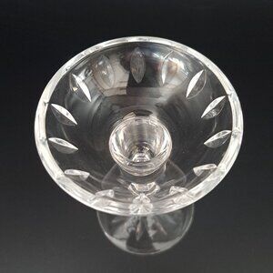 This crystal candlestick holder showcases an elegant etched design. Its clear crystal structure adds a touch of sophistication and classic beauty to any setting.