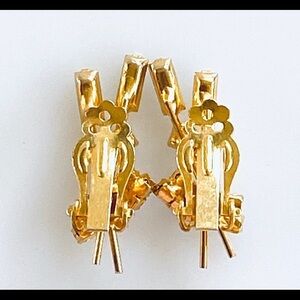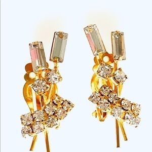 This is a beautiful pair of vintage gold tone clip on earrings. The earrings are 1 1/4” by 1/2”. The earring are in a very nice vintage condition. There are no missing crystals and clip on mechanism functions well. Please, see pictures for more details.