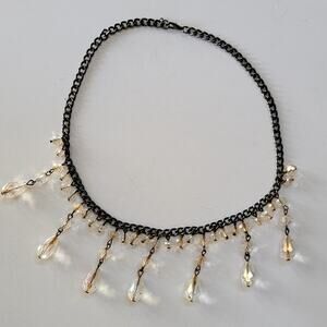 This vintage crystal drop necklace features a striking combination of sparkling faceted glass beads and a bold dark-toned chain, creating a dramatic yet elegant piece of jewelry. The necklace is designed with alternating small faceted beads and larger teardrop-shaped crystal drops, each shimmering with light-catching brilliance. Measuring approximately 18 inches in length, it sits gracefully along the neckline, making it ideal for both evening wear and special occasions. The faceted crystal drops add movement and sparkle, while the dark chain provides a vintage contrast that enhances its old-world charm. This necklace closes securely with a hook clasp, ensuring comfortable and reliable wear. Its timeless design makes it versatile enough to complement gowns, cocktail dresses, or even to elevate a simple blouse. Perfect for collectors of vintage jewelry or anyone who loves statement accessories with a touch of sparkle, this necklace also makes a thoughtful gift.