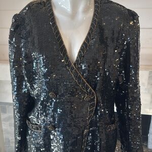 Luxurious vintage black & gold double breasted sequin & beaded blazer with shoulder pads & pockets