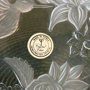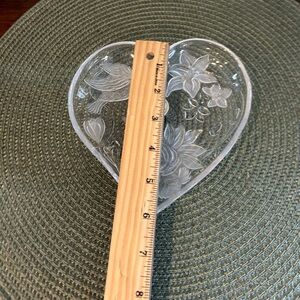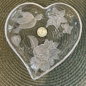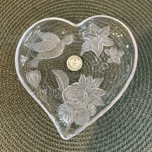 This is a beautiful Crystal Heart Shaped Candy Dish it has beautiful Hummingbird & Floral Design.