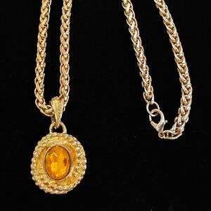 This Vintage Crystal Gold-Plated Necklace features an oval-shaped amber color crystal as the main stone, on a gold-plated foxtail style chain.